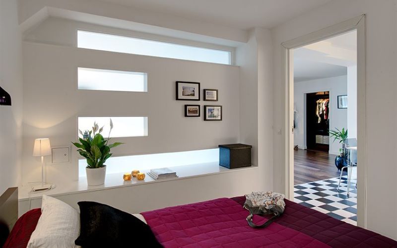 Используйте как можно больше настенных, потолочных и встроенных светильников — в нишах (которые, кстати могут отвлечь от отсутствия окна), за мебелью, за потолочными карнизами, по периметру потолка. Это могут быть обычные светодиодные ленты или встроенные световые короба — современная светотехника способна сотворить чудо в маленьком помещении.