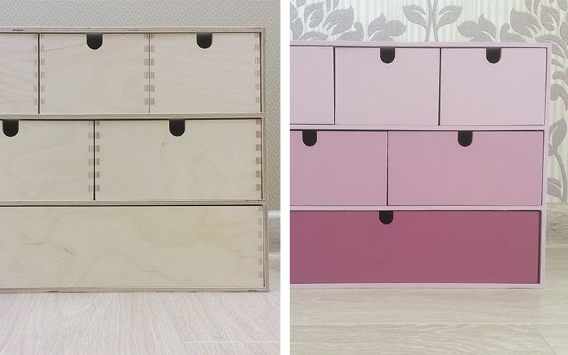 - Акриловая краска выбранных цветов. Так как у нашего мини комода несколько ящиков, то решили выкрасить их разными оттенками. Я использовала розовую и бежевую (розовая — под цвет обоев в комнате).