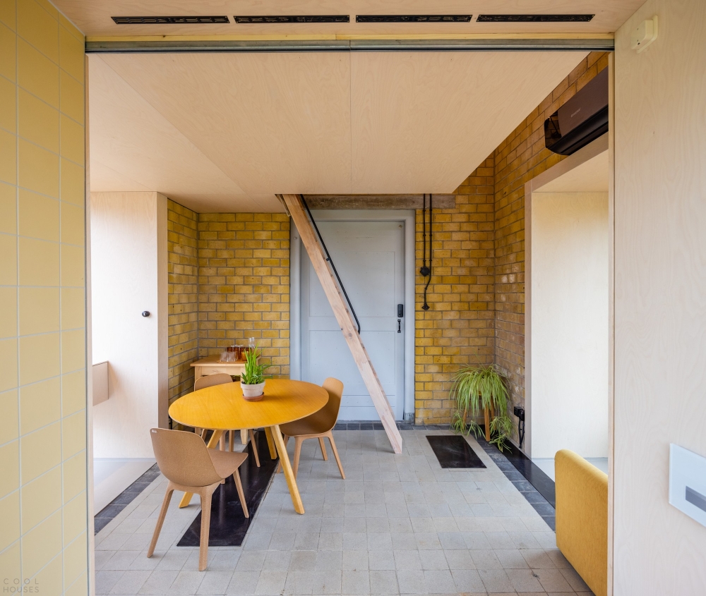 Внутренний облик подвергся радикальной реорганизации: сохранились лишь плиточный пол и участок внутренней стены с жёлтой кирпичной кладкой — эти элементы выступают как материальные «следы» прошлого. Бывший дымоход был трансформирован в световой люк, который наполняет антресоль естественным светом. На основном уровне организовано открытое общественное пространство: гостиная с диваном, компактная кухня с обеденной зоной и санузел с душем. Интерьер сведён к единому монохромному «мебельному организму» — крупной деревянной конструкции, выполненной из окрашенной берёзовой фанеры, которая объединяет функции хранения, кухонного блока и сидячих мест в единую скульптурную форму.