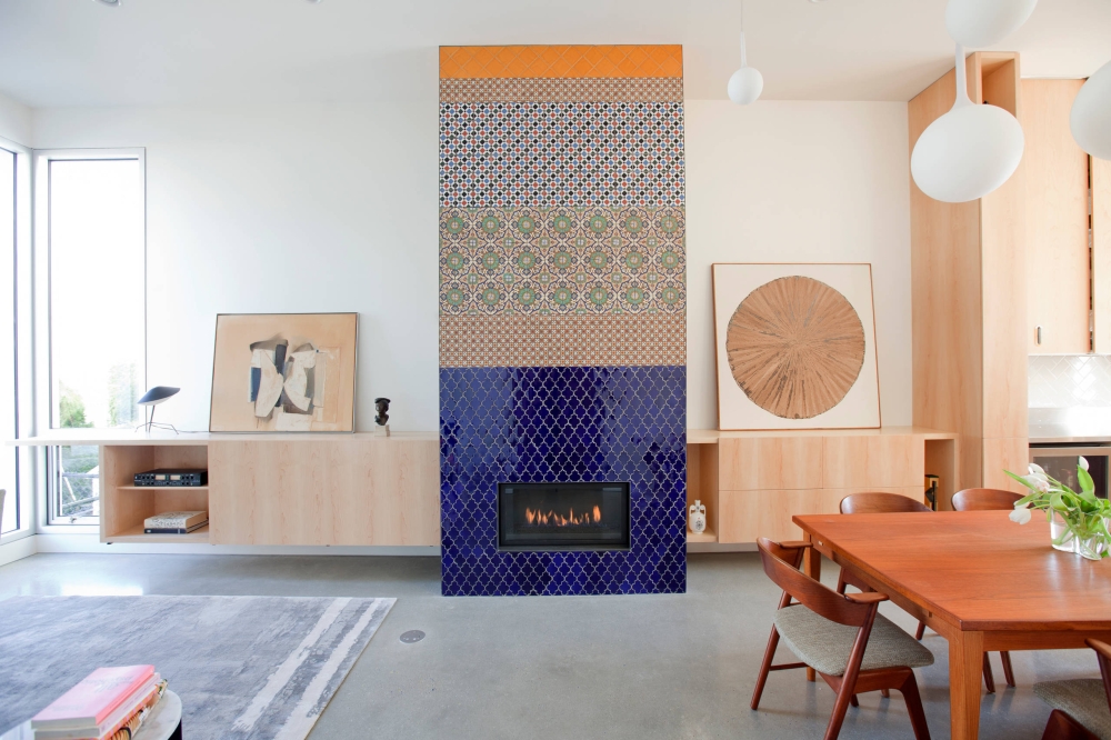 Камин — идеальная платформа для смелой графики: облицовка яркой плиткой превращает очаг в центральный архитектурный акцент. «Комбинируйте узоры и мотивы, например, с отсылкой к испанской традиции», чтобы добиться эмоциональной насыщенности и визуальной выразительности; смешение рисунков создаёт динамику, делая камин и функциональным, и художественным центром комнаты.