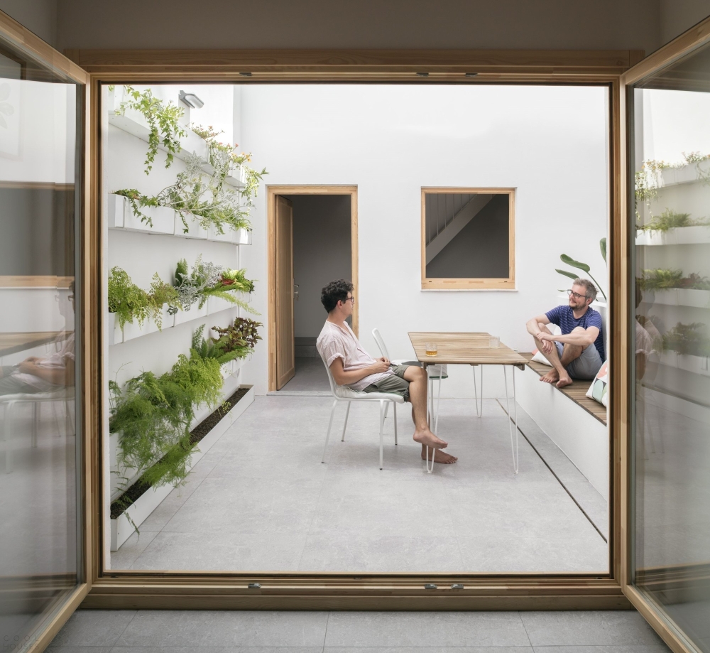 Общая площадь трехэтажного дома составляет 117 квадратных метров. Ландшафтный дизайн внутреннего дворика создает ощущение улицы, поддерживаемое скамейками и зелеными растениями. Изюминкой проекта является вертикальный сад в виде мозаики зелени в самой тенистой части внутреннего дворика. Кроме патио, дом имеет еще один двор в задней части дома. Терраса на втором этаже использует самую солнечную сторону, что позволило превратить ее в солярий.