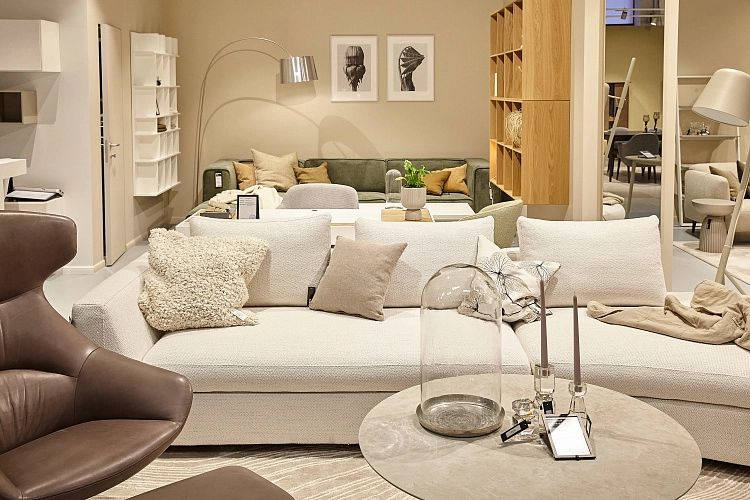 В гостиной оборудована зона ТВ с ТВ-панелью и тумбами для хранения от Giulia Novars. Её украшают интерьерные вазы BoConcept, которые служат декоративным акцентом и вместе с тем не раздражают глаз ярким пятном и удачно вписываются в спокойную цветовую гамму интерьера.